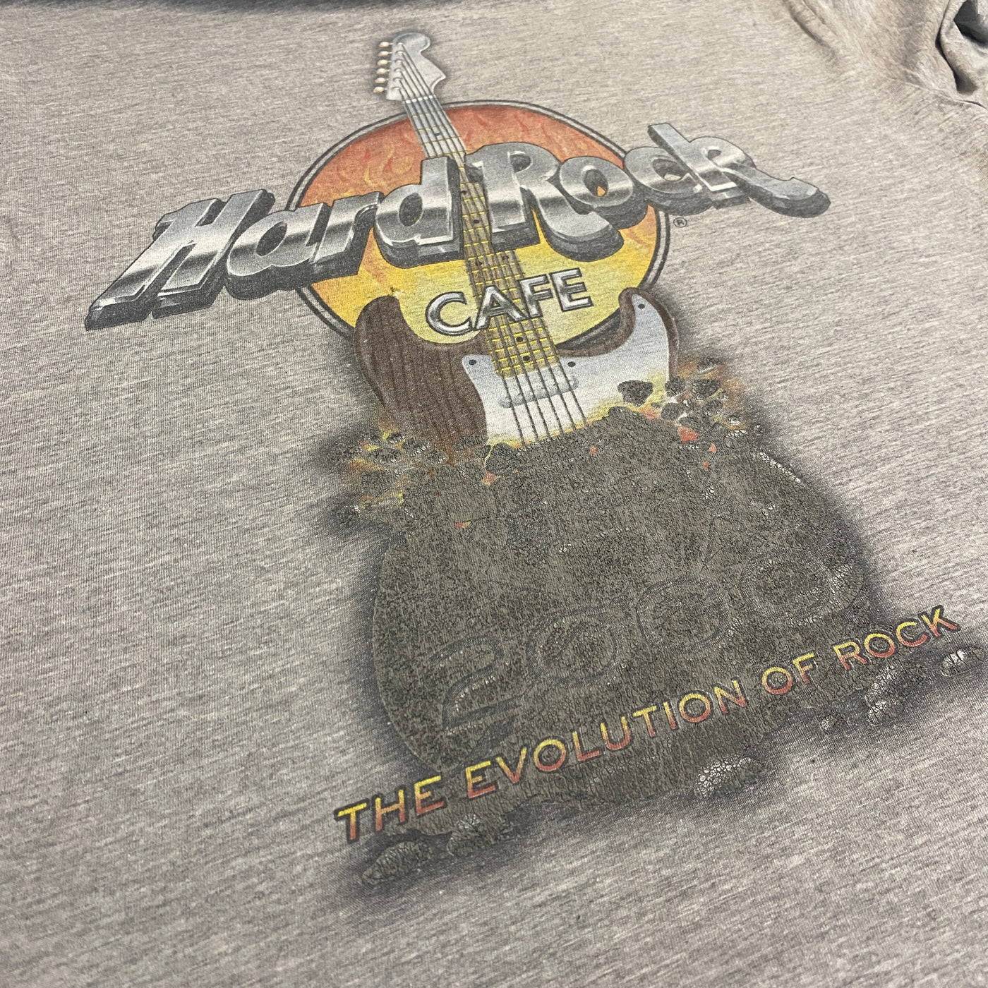 Camiseta vintage Hard Rock Cafe Paris 2000 "The Evolution of Rock" en gris heather (gris melange vintage con patina natural y lavado vivido que le da rollo auténtico Y2K/early 2000s, cozy y rockero), corte relajado clásico con vibe street-rock/collector. Diseño bold y statement: logo frontal pequeño bordado "Hard Rock Cafe Paris" en multicolor con degradado naranja-rojo (eye-catching y nostálgico), print trasero grande impactante: guitarra Fender con fondo naranja sunset, amp rock y detalles "2000 The Evolution of Rock" (muy icónico y coleccionable de la era millennial).