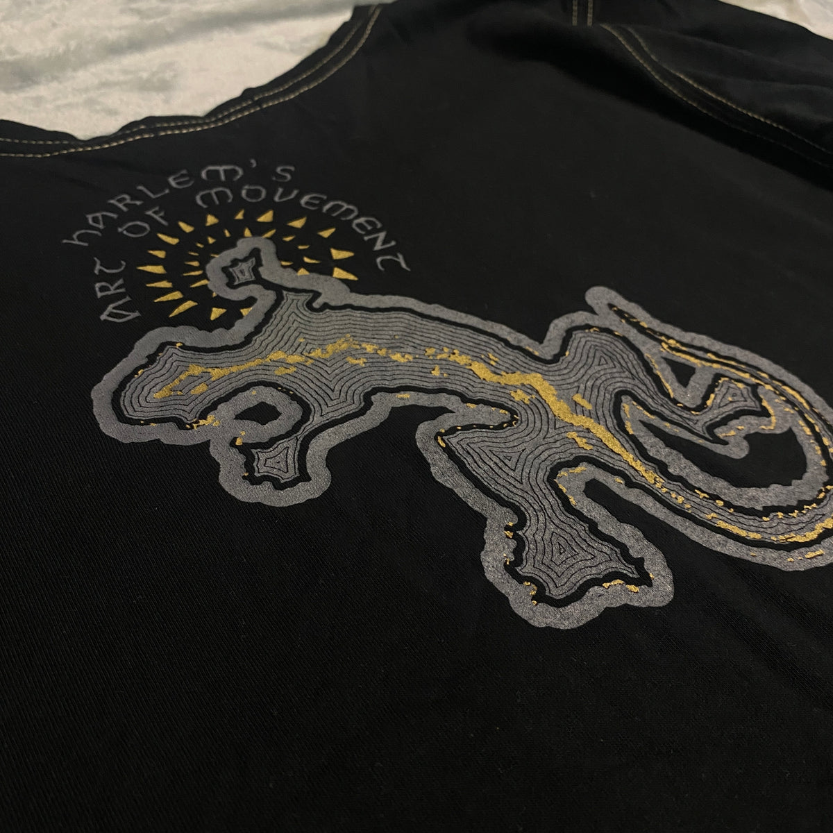 Camiseta vintage Harlem's en negro (negro lavado con patina natural, rollo street-hiphop/urban 90s auténtico y cozy), corte fitted con vibe early 2000s urban. Diseño bold y statement: print trasero grande bordado multicolor – lagarto estilizado con sol tropical, texto "HARLEM'S ART OF MOVEMENT" arriba y "TROPICAL" en dorado (eye-catching, nostálgico y arty), costuras contrastadas en amarillo oro.