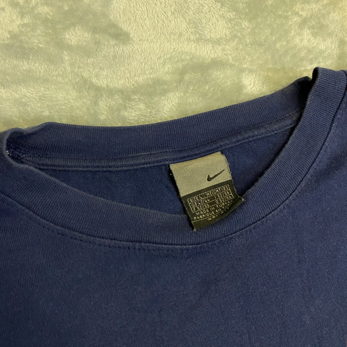 - Cuello redondo clásico con ribete doble cosido en el mismo tono (resistente y con caída natural, cuello ligeramente más ancho típico de las camisetas Supreme/Nike de entonces)