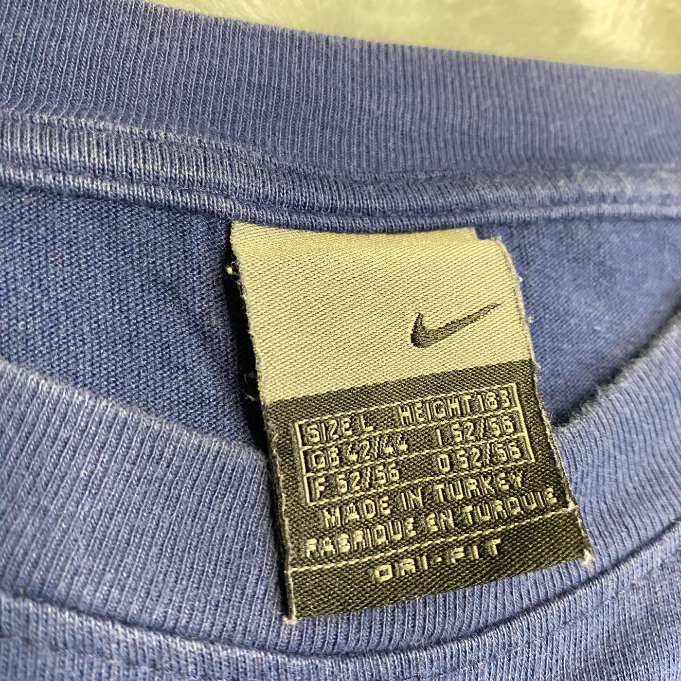 - Mezcla algodón/poliéster con paneles malla (etiqueta confirma producción Nike estándar de la época: algodón principal + poli para durabilidad y malla 100% poliéster para ventilación)