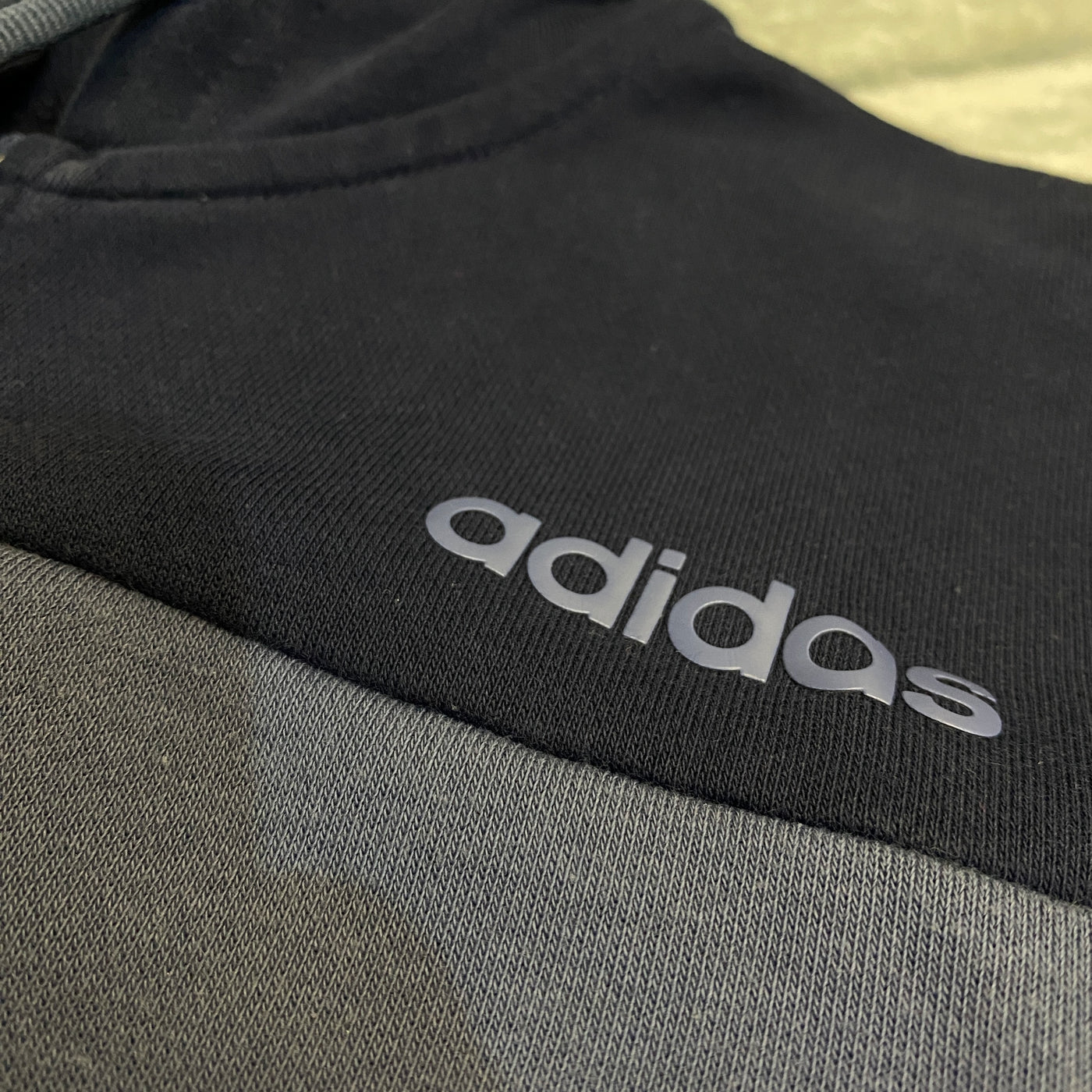 Chaqueta vintage Adidas en azul marino (azul oscuro lavado con patina natural, rollo sport-retro 90s auténtico y cozy), corte oversize relajado con vibe urban-athletic. Diseño clean y statement: capucha con cordones, cremallera frontal, paneles contraste gris, logo Adidas pequeño pecho, puños y bajo elásticos.