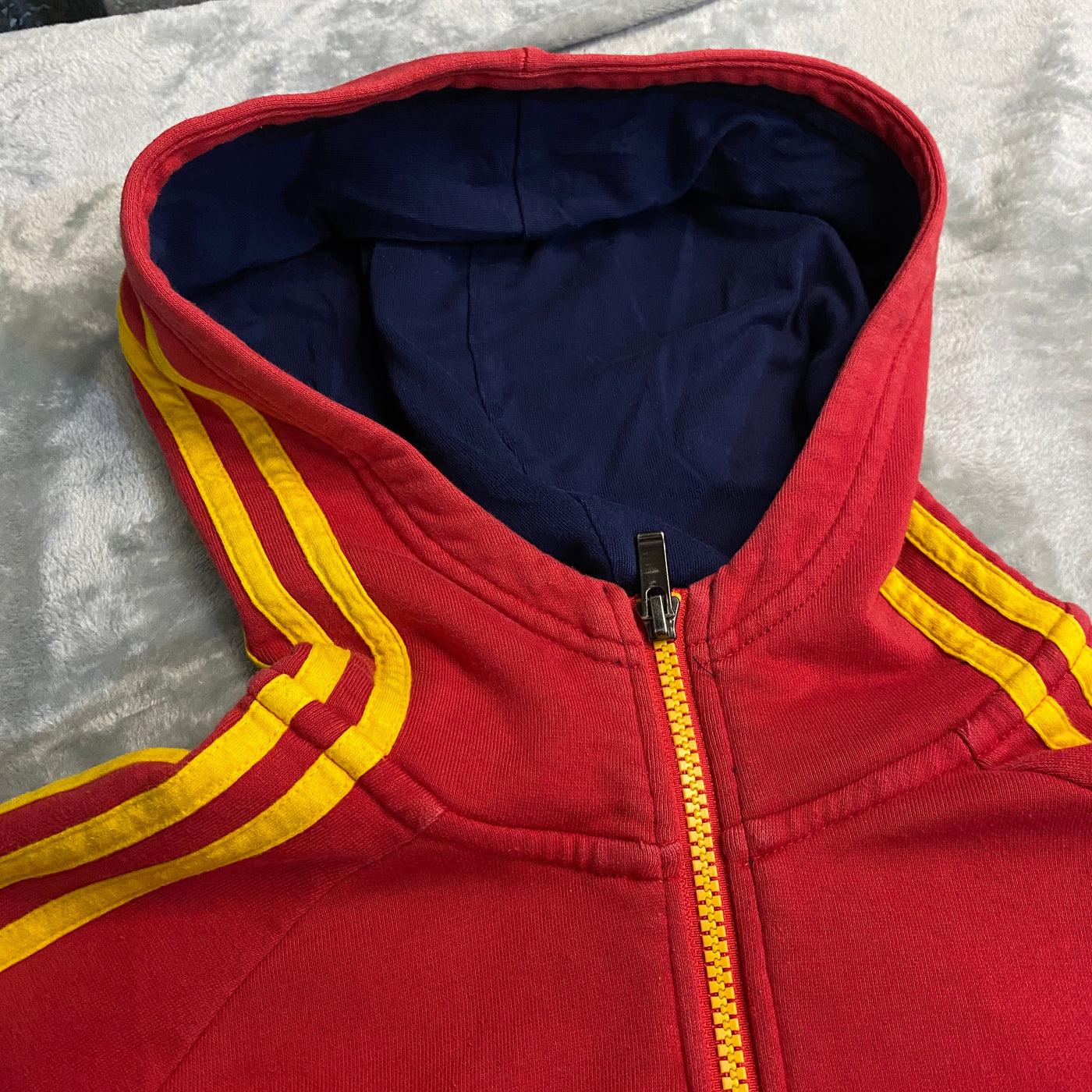 Chaqueta track jacket Adidas en rojo intenso (rojo clásico Selección Española con patina natural y lavado vivido que le da rollo vintage 90s/2000s auténtico y patriótico), corte relaxed oversize con vibe retro fútbol/heritage. Diseño icónico y statement: cuello alto con cremallera completa (zipper amarilla metálica signature), tres rayas amarillas en hombros y mangas completas (detalle España clásico y reconocible), paneles color block en rojo, amarillo y azul marino (efecto tricolor bandera), logo Adidas bordado pequeño en pecho izquierdo y detalle Selección en interior o etiqueta (heritage puro), bolsillos laterales con abertura, bajos y puños elásticos en azul marino con ribete amarillo.