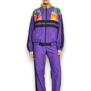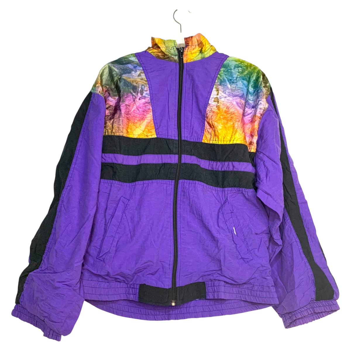 Chaqueta ligera Rodeo en morado intenso (púrpura vibrante con patina natural y lavado vivido que le da rollo vintage-90s auténtico y explosivo), corte oversize/relaxed con vibe rave/rainbow sportswear retro. Diseño icónico y bold de la era: cuello alto con cremallera completa (zipper negro metálico), paneles color block en hombros y mangas con tie-dye psicodélico en arcoíris (tonos naranja, amarillo, verde, azul, rosa y morado fundidos en nubes/mar), cuerpo principal morado con paneles negros horizontales en pecho y espalda (efecto racing o windbreaker clásico), bajos y puños elásticos ajustados en morado, costuras reforzadas con costura azul contrastante visible (detalle handmade/raw), forro interior en tonos degradados arcoíris (muy táctil y colorido). Tejido de nylon/poli crujiente con acabado satinado/iridiscente (resistente al viento, transpirable y de secado rápido), peso medio-bajo (ideal para primavera/otoño, layering o uso diario), lavado desgastado con arrugas naturales, manchas orgánicas sutiles y textura ligeramente crujiente que suma carácter raw vintage premium.