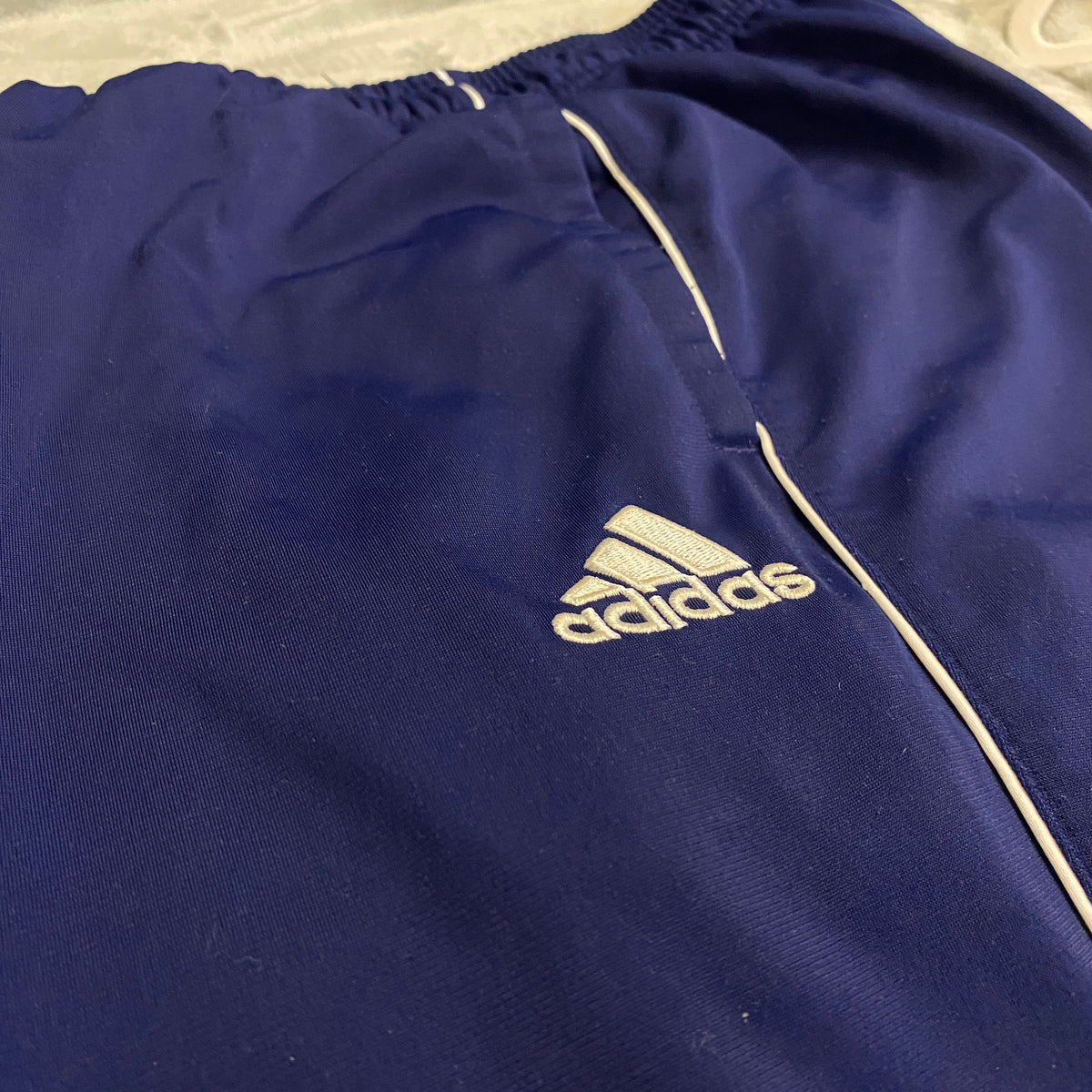 Chándal largo Adidas en azul marino oscuro (navy profundo con patina natural y lavado vivido que le da rollo vintage-sport auténtico y elegante), corte clásico track/jogger con vibe 2000s/essentials. Diseño limpio y funcional: cintura alta elástica con cordón ajustable, bolsillos laterales profundos con ribetes, bajos con puños elásticos ajustados (fit jogger sutil), paneles laterales con tres rayas blancas icónicas (detalle signature Adidas que resalta sin exagerar), costuras reforzadas y logo Adidas bordado pequeño en blanco en la pierna izquierda. Tejido de nylon/poli técnico ligero con interior suave (posible mesh o forro fino), transpirable, resistente al viento y de secado rápido, peso medio-bajo (cómodo para otoño/invierno o layering), lavado desgastado con manchas orgánicas sutiles y textura ligeramente arrugada que suma carácter vintage premium.