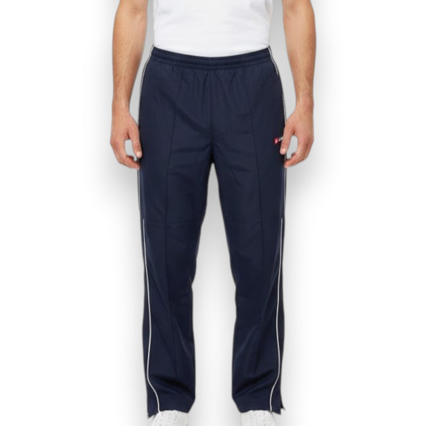 Pantalón largo Lotto en azul marino oscuro (navy profundo con patina natural que le da rollo sport-vintage auténtico y elegante), corte clásico de chándal/track pants con vibe 90s/2000s. Diseño deportivo y funcional: cintura elástica alta con cordón ajustable, bolsillos laterales profundos con cremallera en uno (detalle práctico), paneles laterales con líneas blancas icónicas (estilo Lotto signature), bajos con cremallera lateral para fácil puesta/quita (ideal sobre botas o zapatillas), costuras reforzadas y tejido de nylon/poli ligero con interior mesh para transpirabilidad y secado rápido (tecnología Lotto típica de la época). Lavado vivido con manchas orgánicas sutiles, desgaste natural en zonas de movimiento y textura ligeramente arrugada que suma carácter vintage sin exagerar.