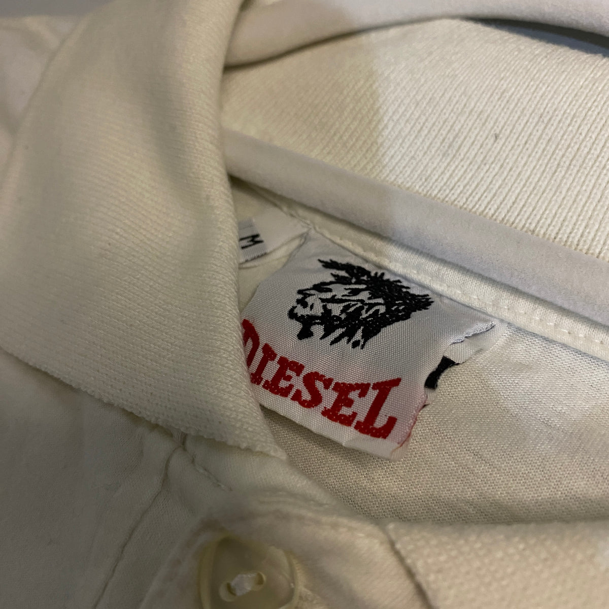 Polo Diesel vintage en blanco crema desgastado con un print gráfico brutal y caótico de los 90s: fondo de hexágonos negros tipo malla/tech que cubren hombros, mangas y laterales, más un diseño explosivo en la espalda y pecho con líneas abstractas en rojo, azul marino y verde neón, salpicaduras, manchas y tipografía distorsionada "DIESEL" en rojo y verde que grita attitude industrial y street de la época. El cuello mao en blanco con ribete sutil, 3 botones perlados translúcidos y logo Diesel bordado en negro con león rampante en el pecho izquierdo (detalle icónico y premium que confirma autenticidad).