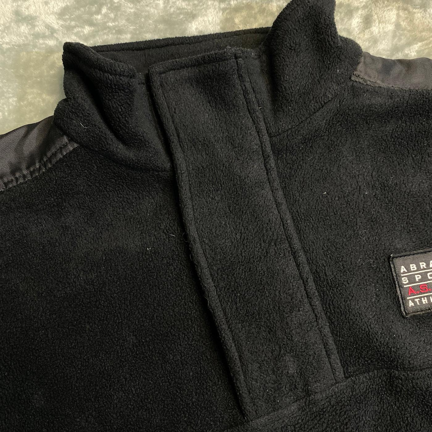 Chamarra vintage Abrams Sport (Athl. Dept. 1993) en negro profundo con toques sport-preppy (lavado con patina natural intensa y textura fleece grueso que le da rollo auténtico early 90s / Y2K aesthetic, ultra-cozy y con esa calidez pesada que define las piezas fleece outdoor de la era). Corte oversize boxy con hombros ligeramente caídos, silueta amplia y larga – típico de las chaquetas 1/4 zip fleece de los 90s que hoy se sienten perfectas en aesthetic Mall Goth meets Hot Topic core con toques McBling sporty y Millennium Fashion cozy.