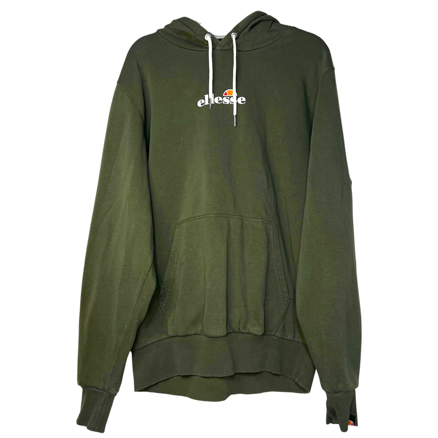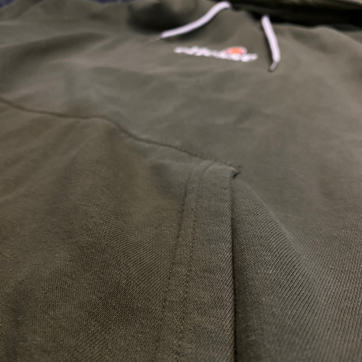 Sudadera con capucha Ellesse en verde oscuro militar (ese tono oliva profundo que da mucho juego y nunca pasa de moda), un básico sportswear premium con rollo heritage italiano. Diseño limpio y atemporal: capucha ajustable con cordones blancos contrastantes, logo "ellesse" en blanco con el sol naranja-rojo bordado en el pecho (detalle icónico y sutil que grita autenticidad), bolsillo canguro delantero, mangas raglán para movilidad y puños/bajo en ribete elástico verde que ajusta perfecto. Tejido interior de felpa suave (mezcla algodón/poli para durabilidad y calidez), corte relaxed/oversize con caída cómoda y algo de patina natural que le da ese toque vintage auténtico.