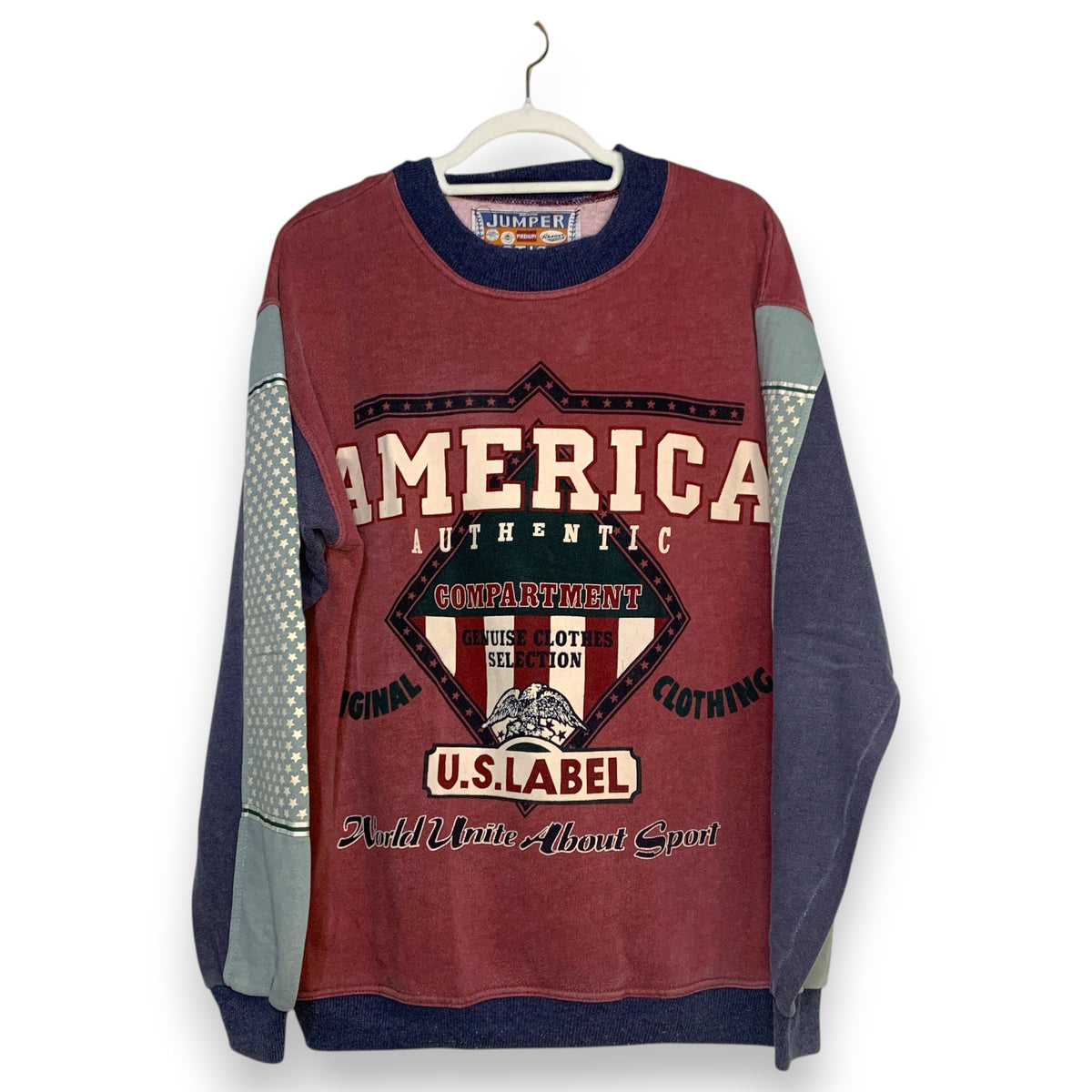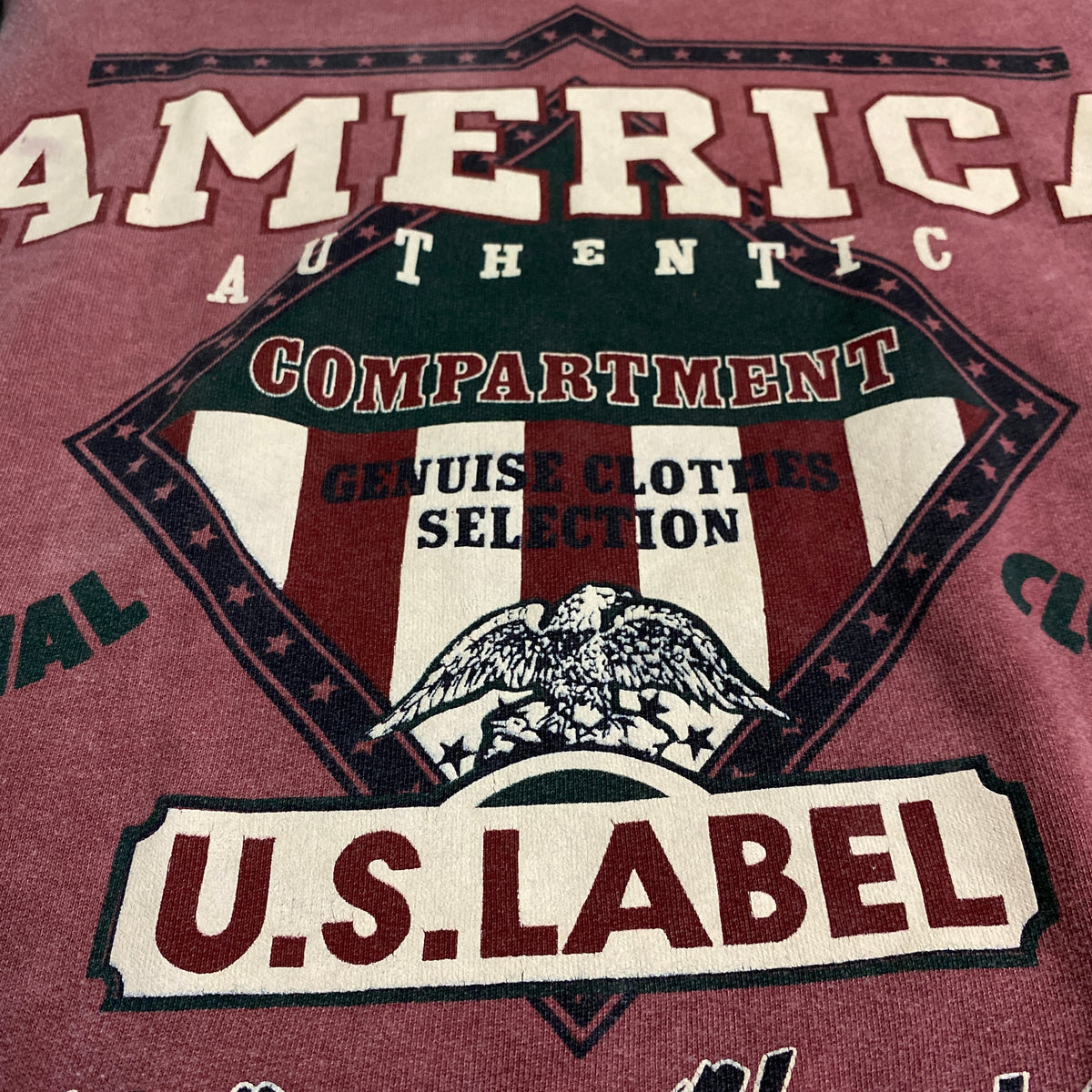 - Print frontal grande y statement: diamante central verde oscuro con borde negro y estrellas blancas, fondo bandera USA rojo-blanco con águila blanca en el centro – texto "AMERICA" arriba en letras blancas bold con sombra negra, "AUTHENTIC" debajo, "COMPARTMENT" en arco interior, "GENUISE CLOTHES SELECTION" en bandera interior, "ORIGINAL" y "CLOTHING" en laterales con estrellas – abajo "U.S. LABEL" en arco grande blanco con sombra negra, "World Unite About Sport" en script cursivo debajo (serigrafía gruesa con craquelado natural pronunciado por lavados – efecto aged vintage deseable y eye-catching, vibe 90s american sportswear patriotic)