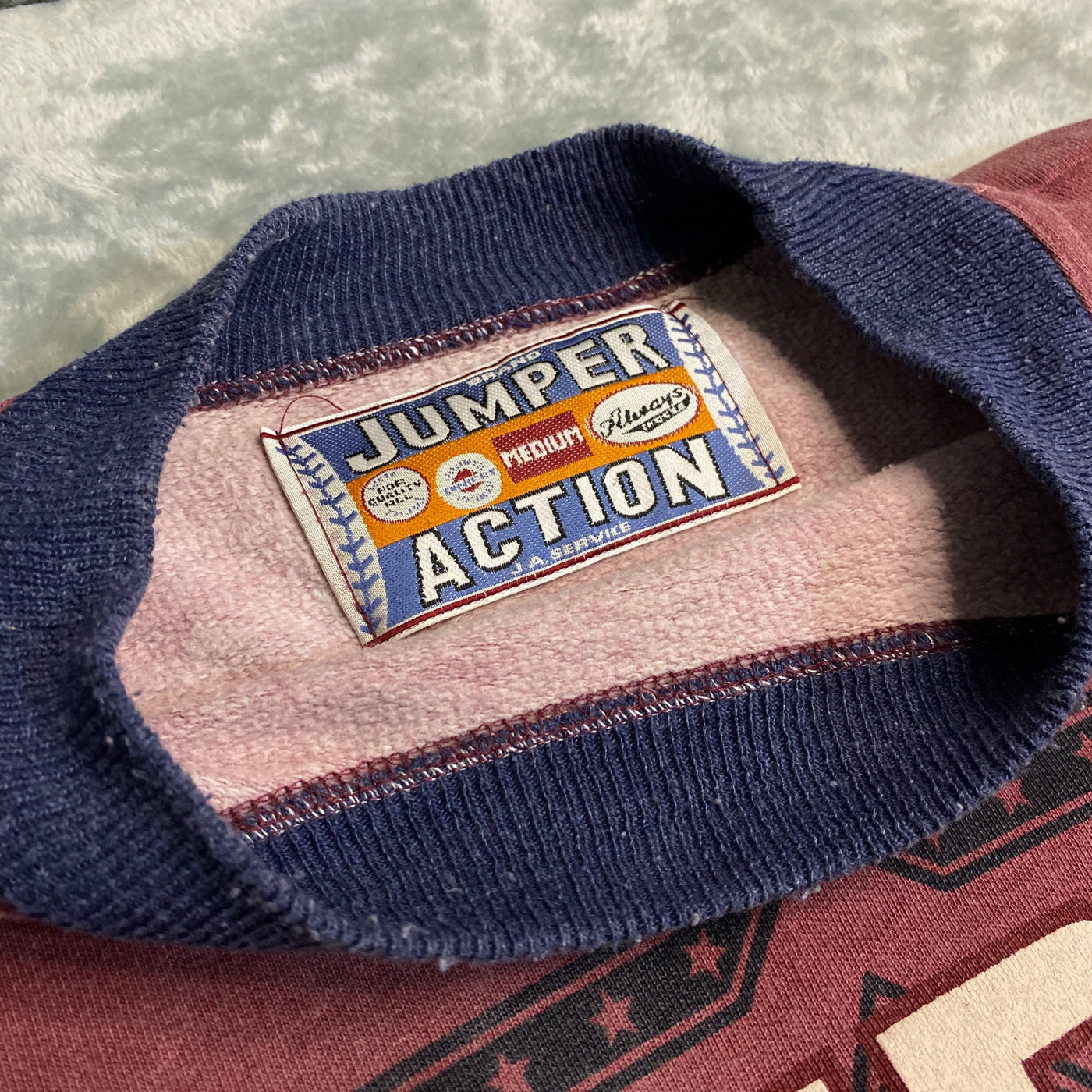 - Etiqueta interior: "JUMPER – MEDIUM – Always Action – J.A. SERVICE – FOR QUALITY ALL" con bordado azul y naranja (detalle premium de la marca 90s, producción típica USA-inspired)