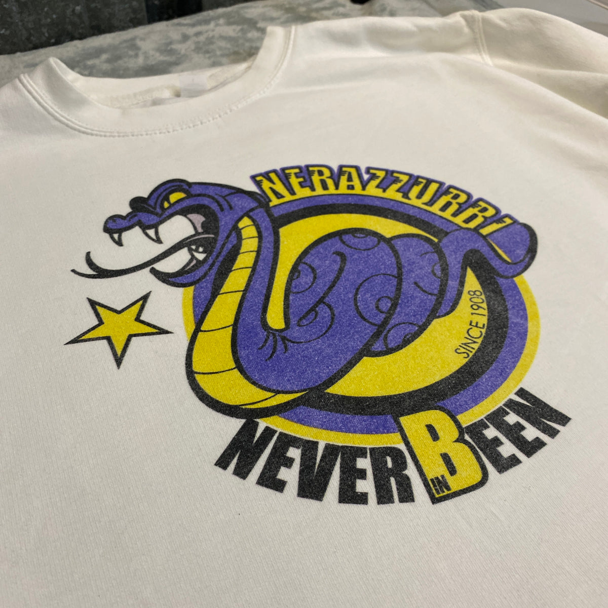 - Print frontal grande y statement: serpiente Nerazzurri morada con ojos amarillos y lengua bífida, enrollada en círculo amarillo con borde morado – texto "NERAZZURRI" en arco superior amarillo bold con sombra negra, "NEVER BEEN" en arco inferior negro bold con efecto cracked, "SINCE 1908" en pequeño abajo, estrella amarilla arriba (serigrafía gruesa con relieve y craquelado natural pronunciado por lavados – efecto aged vintage deseable y eye-catching, vibe Inter Milan ultras/street 2010s)