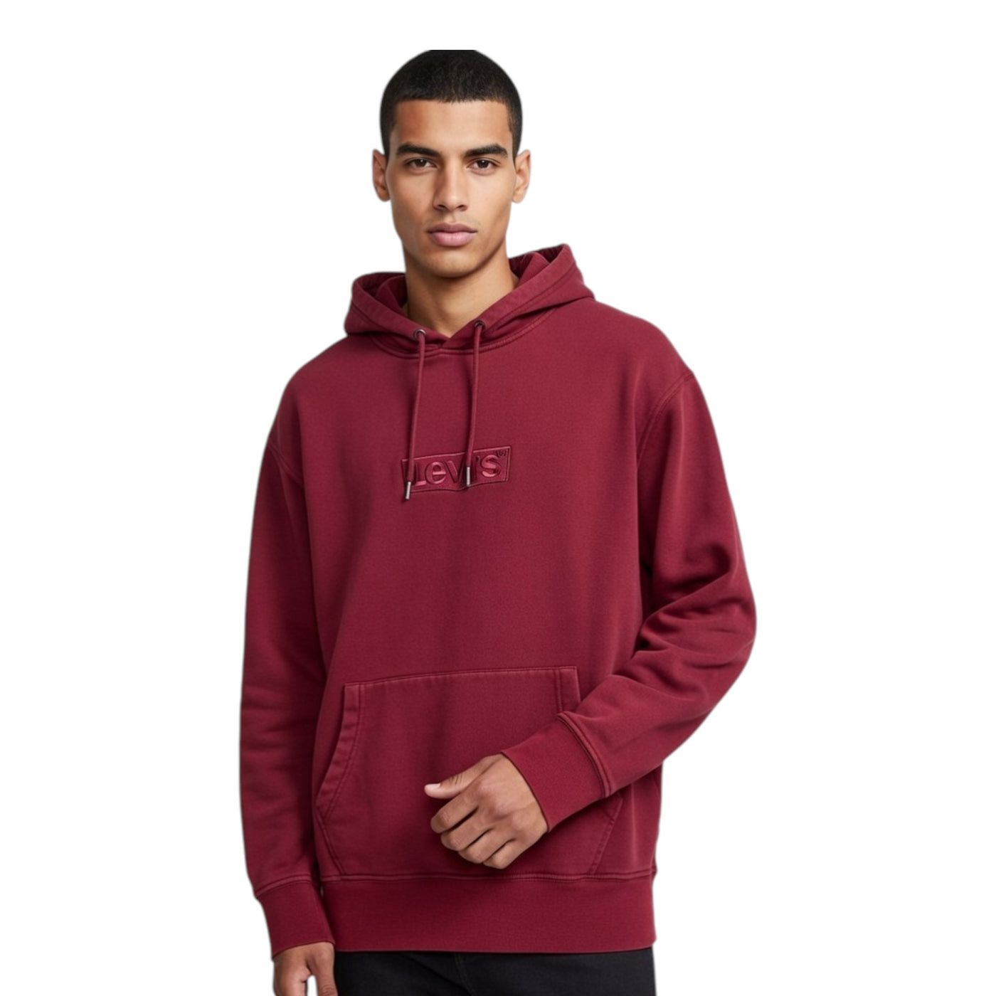 Sudadera Levi's con capucha en un burdeos/marron rojizo intenso y desgastado, ese color vintage que grita autenticidad 90s/2000s. El diseño es minimalista y potente: logo "LEVI'S" bordado en relieve burdeos oscuro en el pecho izquierdo (efecto 3D chunky con patina natural que suma mucho carácter), capucha amplia con cordones burdeos, bolsillo canguro delantero funcional, y corte oversize relajado con caída larga por detrás (estilo cropped asimétrico sutil, bajo más largo atrás). Puños y bajo en ribete elástico burdeos que ajusta bien sin apretar.