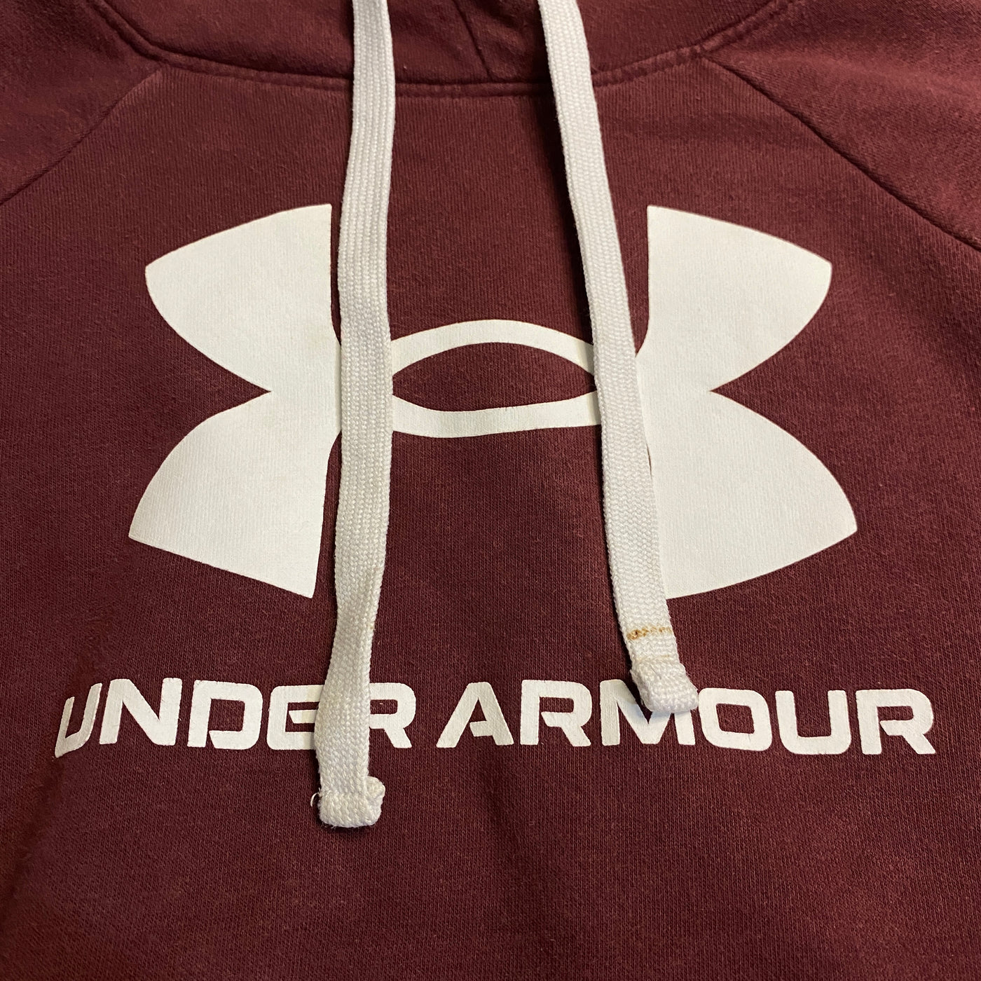 Sudadera hoodie Under Armour en color vino tinto intenso (borgoña/maroon con lavado vivido y patina natural que le da rollo vintage 2010s auténtico y elegante), corte relaxed con vibe athletic-casual premium. Diseño limpio y statement: capucha amplia con cordones blancos ajustables (detalle contraste fresco), cuello alto cruzado que da un fit comfy y estiloso, bolsillo canguro frontal amplio, mangas raglán con costuras reforzadas, bajo ligeramente curvado/high-low sutil (más largo por detrás para mayor cobertura), puños y bajo en ribete elástico vino. Logo Under Armour grande en pecho frontal (impreso blanco con el clásico símbolo UA, muy reconocible y bold).