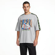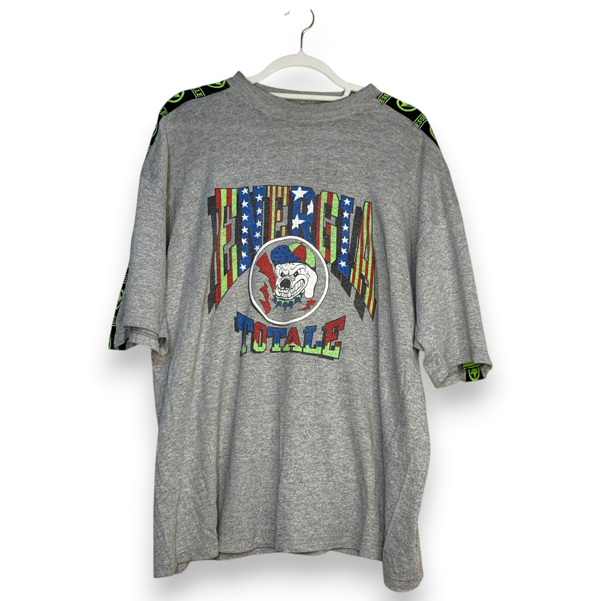 Camiseta vintage Esselle Sportswear "Energia Totale" en gris claro heather (gris melange lavado con patina natural 90s, rollo street-sports auténtico y cozy), corte oversize relajado con vibe early 90s hip-hop/sportswear. Diseño bold y statement: print frontal grande multicolor – bulldog agresivo con gorra, bandera USA, rayos y texto "ENERGIA TOTALE" en letras graffiti con degradado rojo-azul-verde (eye-catching, nostálgico y muy 90s), mangas raglán con cinta ribeteada negra/verde lima repetida "ESSELLE" y logo corona (detalle premium y statement).
