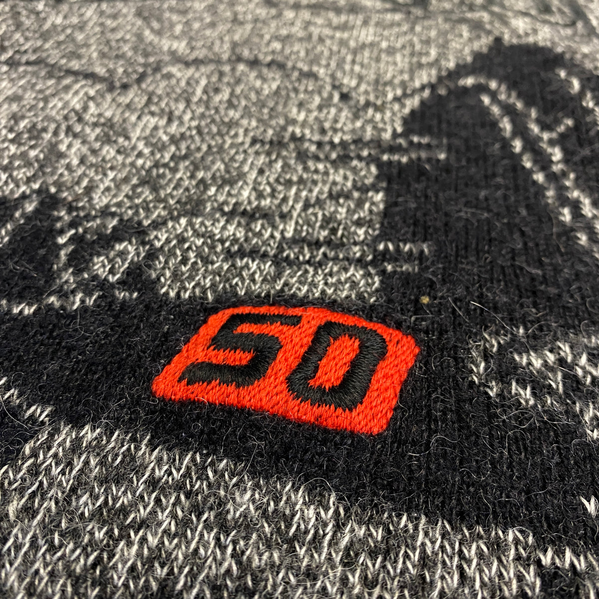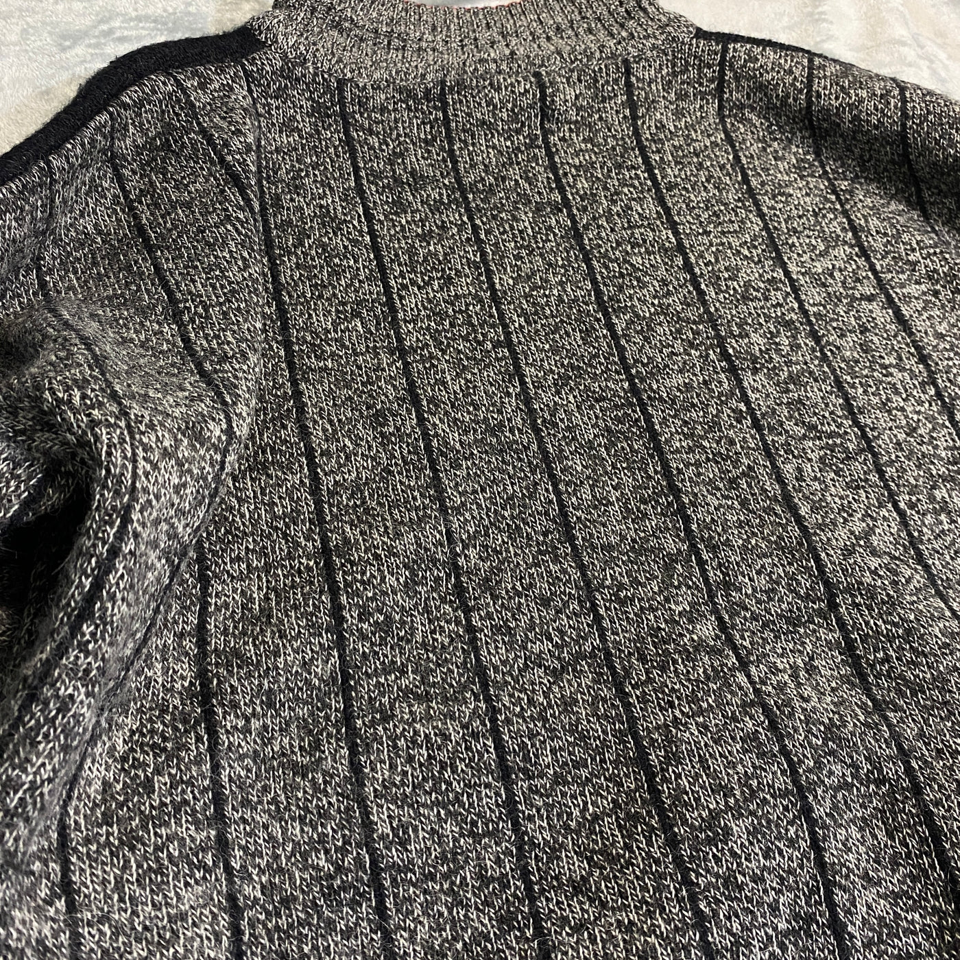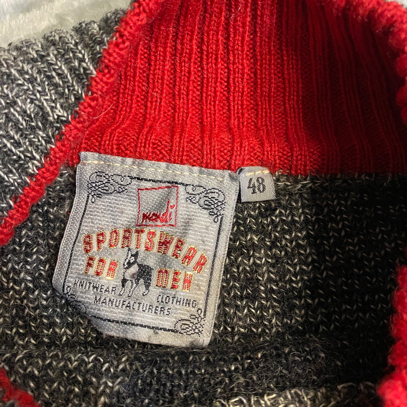 Jersey de punto grueso Mandi en gris carbón melange con negro y rojo (base gris moteado con hebras negras y patina natural que le da rollo vintage-90s auténtico y premium), corte oversize/relaxed con vibe streetwear racing/aero de los 90s. Diseño brutal y statement: cuello alto de canalé con ribete rojo interior visible (pop de color al moverte), hombros y mangas raglán con paneles negros texturizados (efecto estructurado y contrastante), espalda con jacquard intarsia masivo en negro/gris: silueta de avión o moto estilizada con nubes/estela, texto "AEROCLUB" bordado grande en negro relieve y detalle "50" en naranja/rojo flame (motivo aero/racing que suma hype retro brutal), costuras reforzadas y bajos/puños en ribete grueso gris-negro. Tejido de lana/acrilico o mezcla mohair-like (suave, calentito, con textura bouclé/moteada por dentro y fuera, muy táctil), peso medio-alto (ideal para otoño/invierno o layering), lavado vivido con pilling natural, arrugas orgánicas y textura arrugada que suma carácter raw premium.